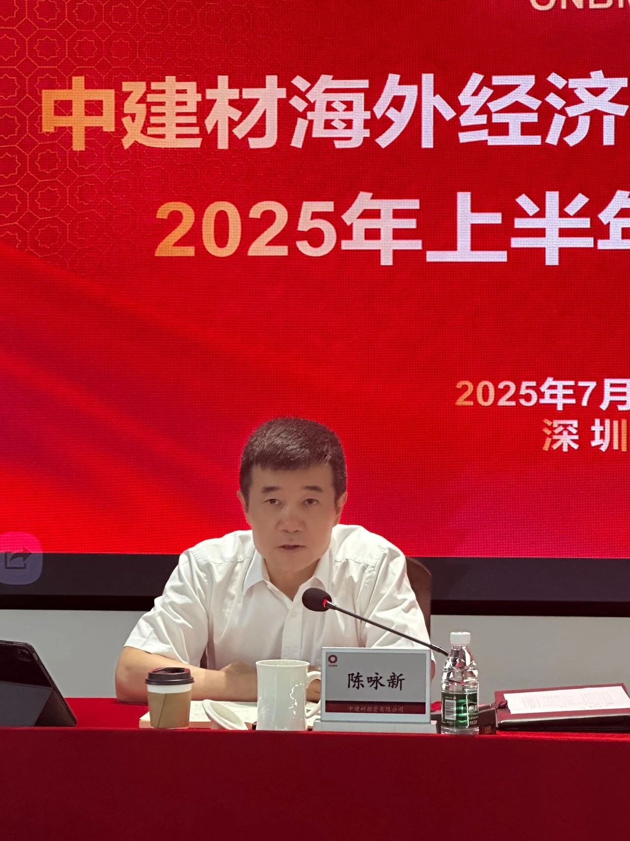 7月17日,中建材海外2025年上半年工作会议在深圳召开,会议总结上半年工作,分析研判形势,部署下半年任务。中建材投资党委书记、董事长陈咏新,党委副书记廖鹤翔出席会议并讲话。中建材海外总经理李韬作了题为《坚持目标导向,深化融合发展,开启公司国际化事业新篇章》的工作报告,南非公司、巴新公司汇报上半年工作经营情况,副总经理邓群学、罗慧华分别汇报公司投资发展工作、信息化工作规划,董事长张欣作公司十五五战略发展规划报告,常务副总经理姜斐主持本次会议。